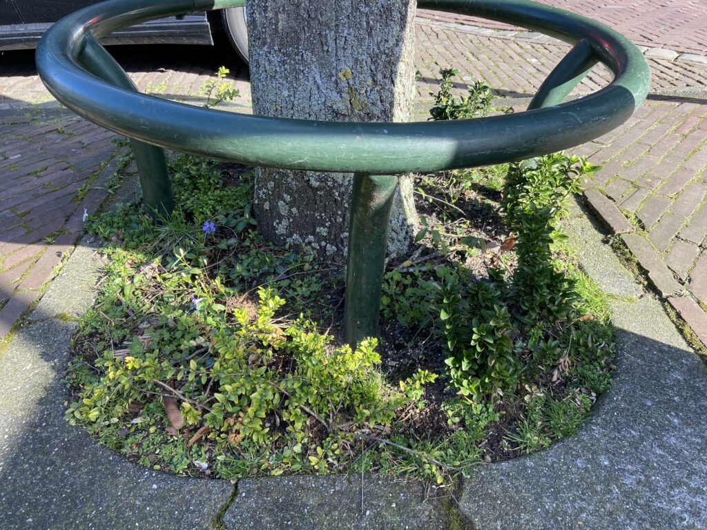 Op enkele plekken wil ik graag lage groenblijvende Japanse heesters aanplanten die een boomspiegel omkaderen. Een voorbeeld staat nabij de openbare brievenbus ter hoogte van het Rijksmuseum van Oudheden. De planten in deze boomspiegel heb ik bij wijze van proef in augustus 2022 aangeplant. Binnen de die hele lage heg heb ik Maagdenpalm (Vinca minor) geplant. Deze staan momenteel eind januari 2023 in bloei.