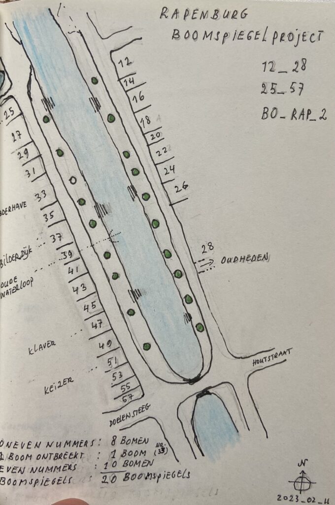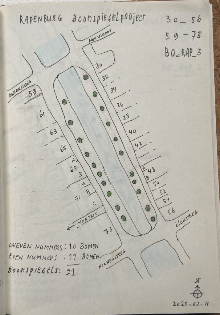 Voor het project heb ik het gebied in drie gedeelten onderscheiden en voor ieder deel een tekening gemaakt met de bomen. Iedere boom (boomspiegel) is genummerd naar het huisnummer waar deze is gelokaliseerd.
