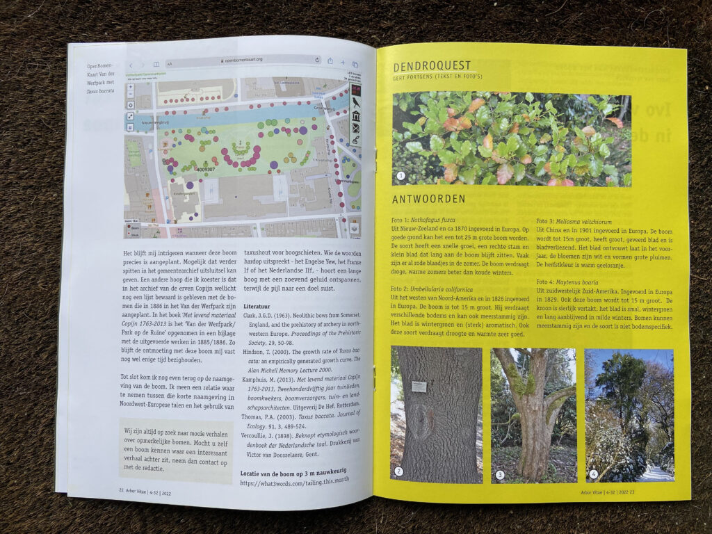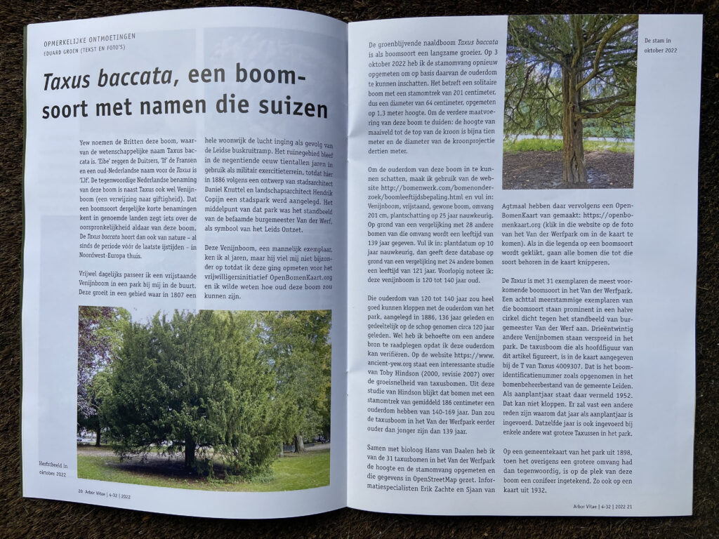 Het verhaal over de Taxus baccata in het Van der Werfpark is in een nader bewerkte versie geplaatst in Arbor vitae, het bulletin van de Nederlandse Dendrologische Vereniging en de Koninklijke Vereniging voor Boskoopse Culturen, jaargang 32, nummer 4, blz. 20-22.